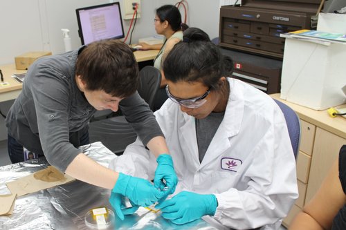 The students from Bishop Carroll High School (Calgary, Alberta) during sample preparation at the IDEAS beamline. They were investigating the airborne transmission of peanut proteins and also researching selenium in nuts and supplements (2014).