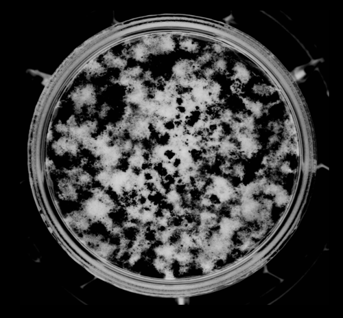 Photo of the rat bone marrow stromal cell culture (bone nodule-left, cell culture chamber insert with mineralized bone nodules in white - middle).