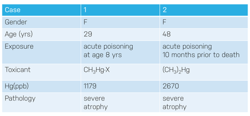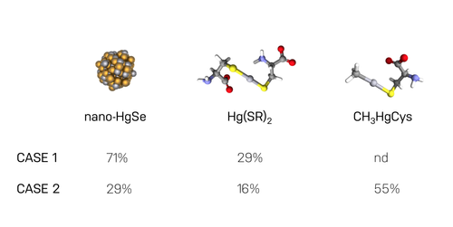 In both organic mercury poisoning cases, we detected the presence of nano-particulate form of mercuric selenide (nano-HgSe). For Case 1, we could not detect any organic mercury left in the brain meaning that the originally deposited methylmercury must have been transformed to inorganic mercury (mercuric biscysteineate and nano-HgSe). For Case 2, we could still detect some of the methylmercury in addition to the inorganic mercury species. This means that the transformation of organic mercury to inorganic mercury takes place in the brain but is not rapid and that selenium is involved in this process. You can find more results in Korbas 2010.